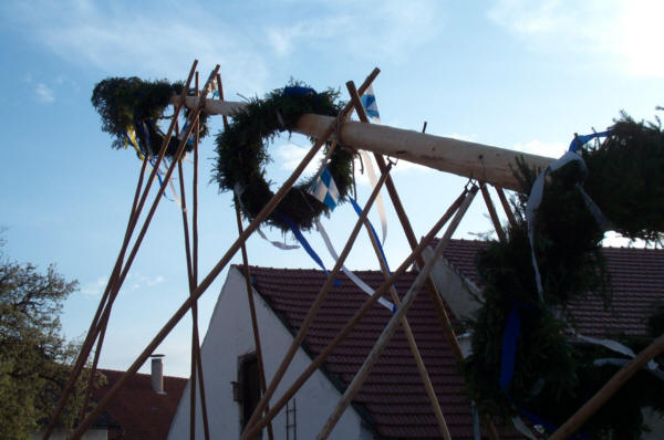 Die Dorfgemeinschaft Weichs stellt 2001 den Maibaum auf