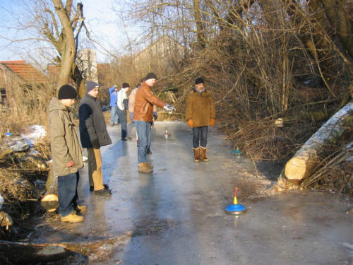 Der "Windl-Weiher" in Weichs war auch am letzten Wochenende wieder fest in der Hand der jungen und junggebliebenen Eisstockschützen. Am Sonntag, den 29. Januar 2006 haben sich ein Dutzend Eisstockschützen eingefunden, um bei herrlichem Winterwetter ihre Zielsicherheit unter Beweis zu stellen. Wenn nach einer längeren, strengen Kälteperiode das Eis endlich trägt, bietet der idyllisch gelegene Weiher ganz ohne menschliche Eingriffe jedes Jahr eine hervorragende Eisfläche für das Eisstockschießen. Die diversen Unebenheiten und Hindernisse im Eis, wie beispielsweise eingefrorene Baumstämme oder sogar Kleidungsstücke, sorgen dabei für eine abwechslungsreiche und anspruchsvolle Bahn.