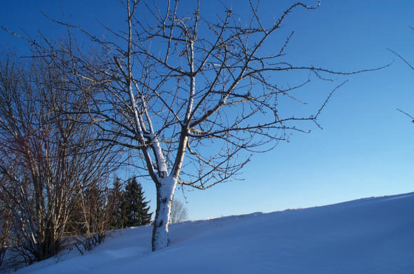 Kräftiger Westwind formte bizarre Gebilde an der Böschung und richtet die Sträucher in Richtung Osten.