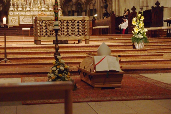 rechten Seite vor dem Volksaltar. Eine Steinplatte deckt die letzte Ruhestätte