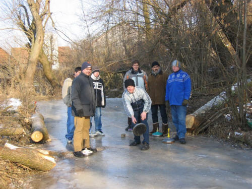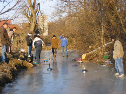 Der "Windl-Weiher" in Weichs war auch am letzten Wochenende wieder fest in der Hand der jungen und junggebliebenen Eisstockschützen. Am Sonntag, den 29. Januar 2006 haben sich ein Dutzend Eisstockschützen eingefunden, um bei herrlichem Winterwetter ihre Zielsicherheit unter Beweis zu stellen. Wenn nach einer längeren, strengen Kälteperiode das Eis endlich trägt, bietet der idyllisch gelegene Weiher ganz ohne menschliche Eingriffe jedes Jahr eine hervorragende Eisfläche für das Eisstockschießen. Die diversen Unebenheiten und Hindernisse im Eis, wie beispielsweise eingefrorene Baumstämme oder sogar Kleidungsstücke, sorgen dabei für eine abwechslungsreiche und anspruchsvolle Bahn.