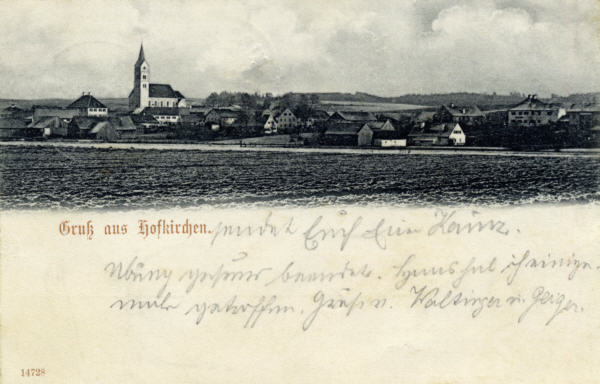 Aus dem Archiv von Herrn Theodor Ebner, ehem. Lehrer und Rektor der Grund- und Hauptschule Hofkirchen stammt eine Postkarte aus dem Jahr 1902 oder jünger. Es handelt sich dabei um eine schwarz/weiß Druck mit der Ansicht von Hofkirchen.